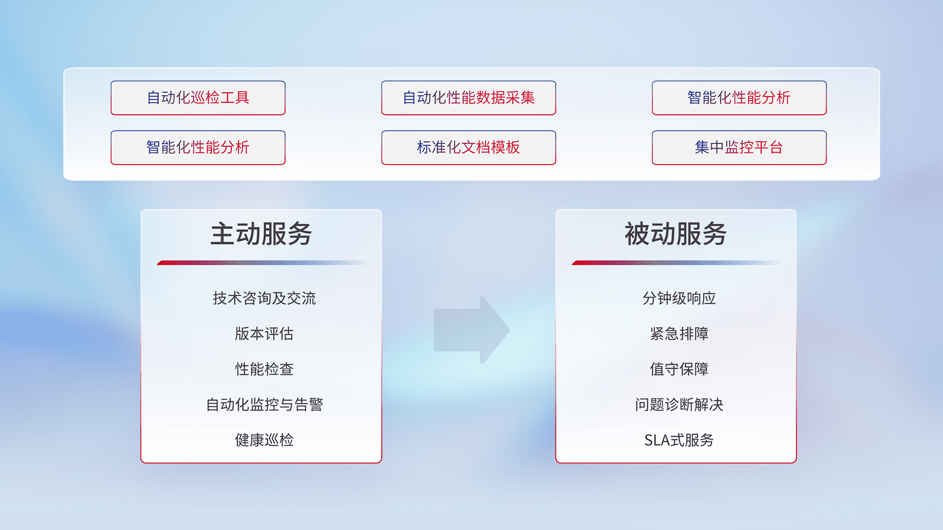 智能化工具和标准化文档,,保障服务质量,,,提供主动服务(包含技术咨询、、、、版本评估、、性能检查、、、、自动化监控与告警、、、、健康巡检)和被动服务包含(分钟级响应、、、紧急排障、、、、值守保障、、、、问题诊断解决、、、、SLA服务)。。